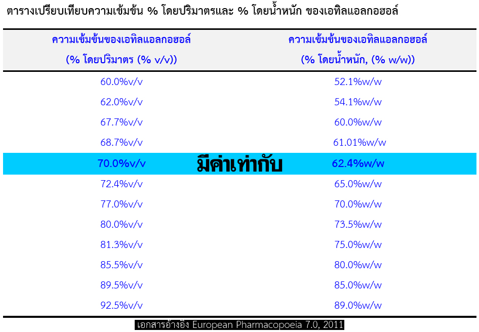 ถ้าฉลากผลิตภัณฑ์ระบุความเข้มข้นของแอลกอฮอล์เป็น % โดยน้ำหนัก (%w/w) จะทราบได้อย่างไรว่าฆ่าเชื้อโรคได้ แอลกอฮอล์เข้มข้น 60-90% โดยปริมาตรในน้ำ (%v/v) เทียบเท่ากับ แอลกอฮอล์ความเข้มข้น 52.1– 85.8% โดยน้ำหนักในน้ำ (%w/w) ดังตาราง ดังนั้นความเข้มข้นของแอลกอฮอล์ที่มีประสิทธิภาพและถูกต้องสอดคล้องกับประกาศตามที่กล่าวข้างต้นคือ แอลกอฮอล์เข้มข้น 70 -90% โดยปริมาตรในน้ำซึ่งเทียบเท่ากับ แอลกอฮอล์เข้มข้น 62.4 -85.8 % โดยน้ำหนักในน้ำ