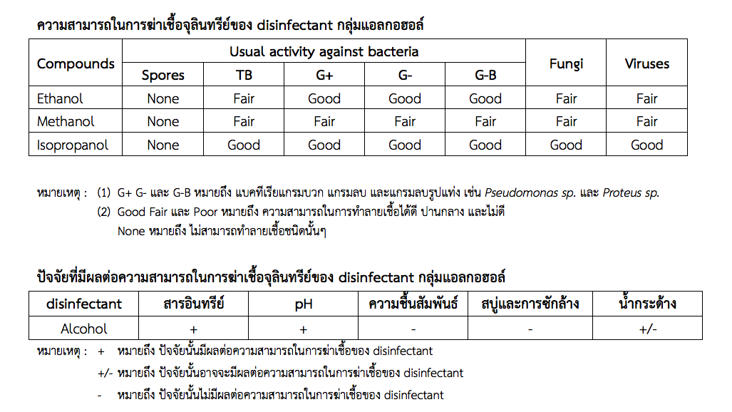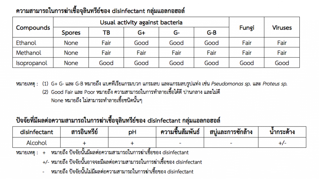 แอลกอฮอล์ที่ใช้สำหรับฆ่าเชื้อโรคโดยทั่วไปมี 2 ชนิด คือ เอทิลแอลกอฮอล์ (ethyl alcohol) และ ไอโซโพรพิล แอลกอฮอล์ (isopropyl alcohol) แอลกอฮอล์ทั้ง 2 ชนิดเป็นของเหลวใส ไม่มีสี ระเหยได้ง่ายที่อุณหภูมิห้อง แอลกอฮอล์มีฤทธิ์ในการทำลายเชื้อแบคทีเรีย เชื้อวัณโรค เชื้อรา และเชื้อไวรัส แต่ไม่สามารถทำลายสปอร์ของเชื้อแบคทีเรียได้ แอลกอฮอล์จัดเป็นสารฆ่าเชื้อที่มีประสิทธิภาพแต่ฤทธิ์ในการทำลายเชื้อของแอลกอฮอล์จะลดลงมากหากความเข้มข้นของแอลกอฮอล์ลดต่ำลง